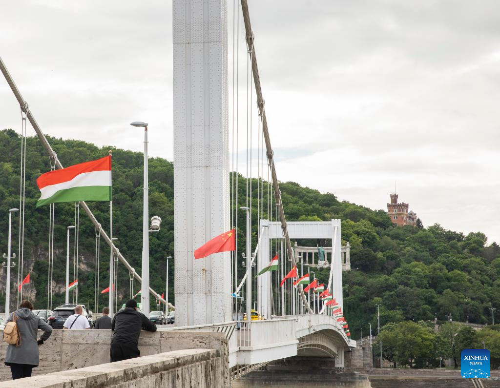 Chinese and Hungarian national flags are seen hoisted in Budapest, Hungary, May 8, 2024. (Xinhua/Zhang Fan)
