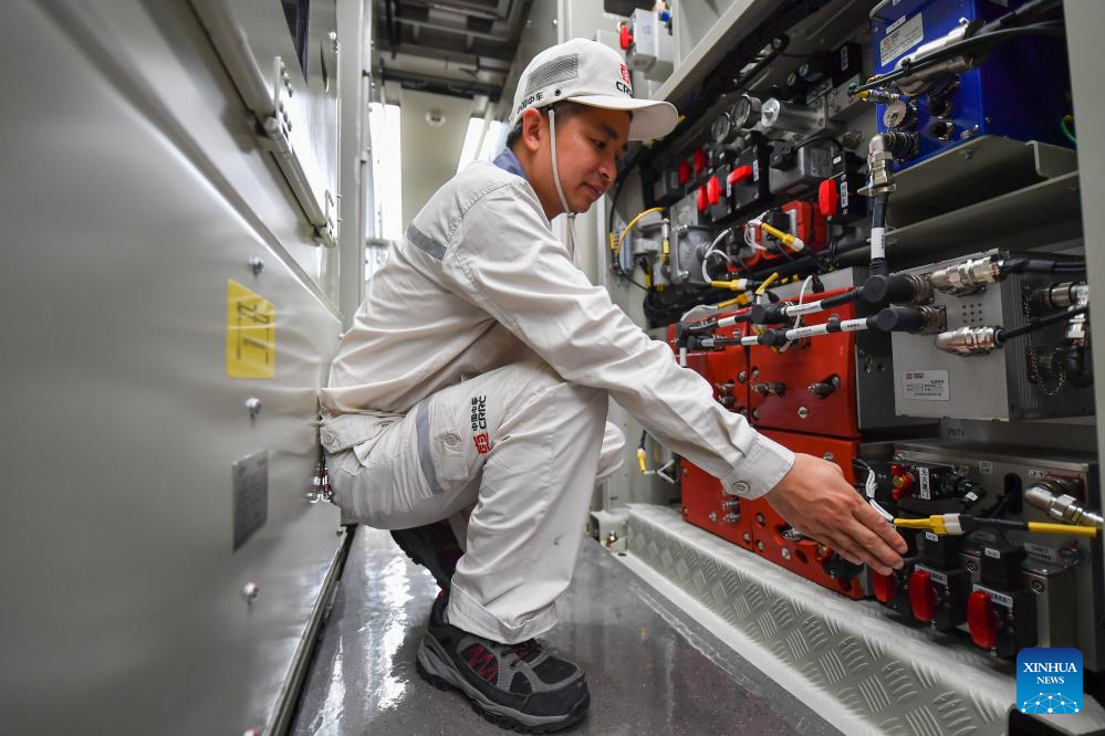 A worker inspects an intelligent heavy-haul electric locomotive in Zhuzhou, central China's Hunan Province, May 9, 2024. An intelligent heavy-haul electric locomotive officially rolled off the production line in Zhuzhou on Thursday. It will be used in the heavy-haul transportation of Shuozhou-Huanghua Railway, China's second-largest channel for coal transport. (Xinhua/Chen Zeguo)