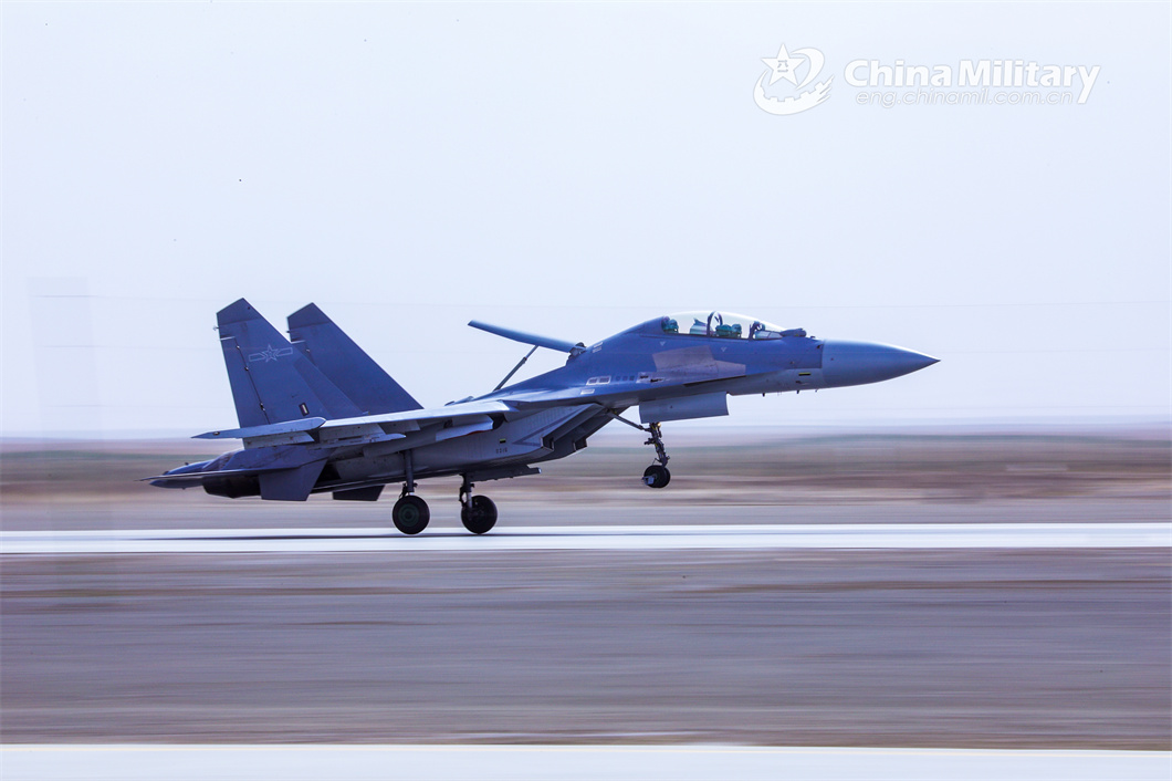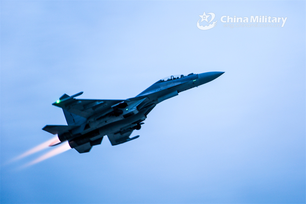 A J-16 fighter jet attached to an aviation brigade under the PLA Air Force takes off in speed during a round-the-clock confrontational air-battle training exercise in April, 2023. (eng.chinamil.com.cn/Photo by Liu Dezheng)