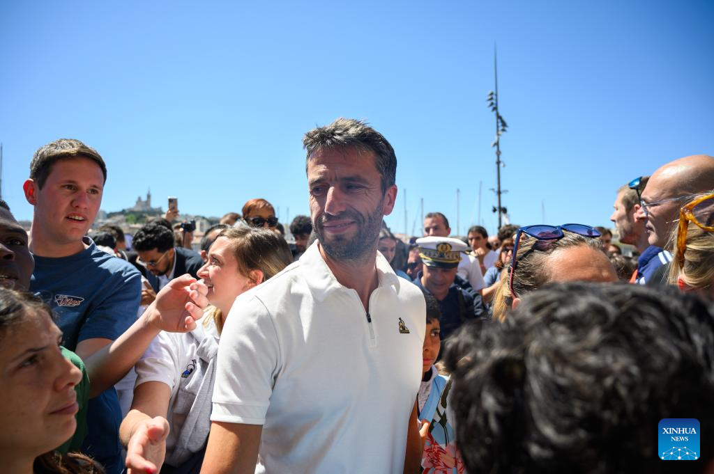 President of the Paris 2024 Olympics and Paralympics Organising Committee Tony Estanguet (1st R Front) speaks in a TV interview during the relay of the Olympic flame of Paris 2024 in Marseille, France, May 9, 2024. (Photo by Julien Mattia/Xinhua)