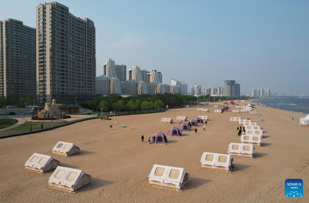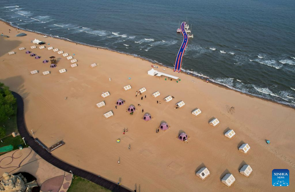 Tourists enjoy themselves by a tent at a camping site of a coastal scenic area in Qinhuangdao, north China's Hebei Province. The newly opened camping attracts tourists to experience the fun of camping. (Xinhua/Yang Shiyao)