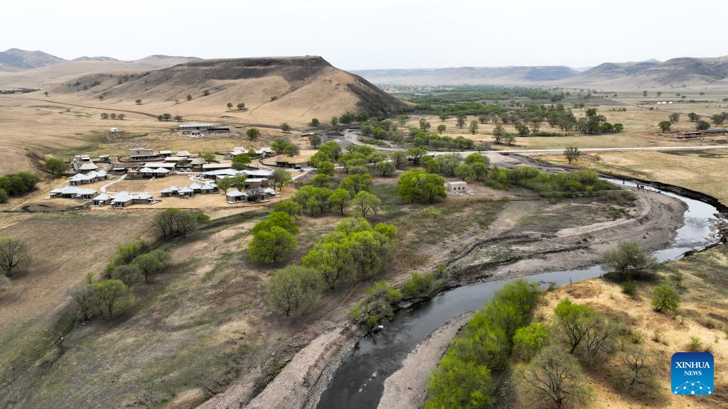 A drone photo taken on May 10, 2024 shows a grassland homestay cluster on the Ulan Mod grassland, located in Horqin Right Wing Front Banner, Hinggan League of north China's Inner Mongolia Autonomous Region. In recent years, a grassland homestay cluster in Hinggan League of north China's Inner Mongolia Autonomous Region, has become a new driving force for the high quality development of grassland tourism. The cluster concludes homestays, hotels, libraries, bakeries, cafes, art galleries and other facilities with modern and traditional elements, providing a place for tourists to relax and enjoy the scenery of the Ulan Mod grassland. (Xinhua/Bei He)