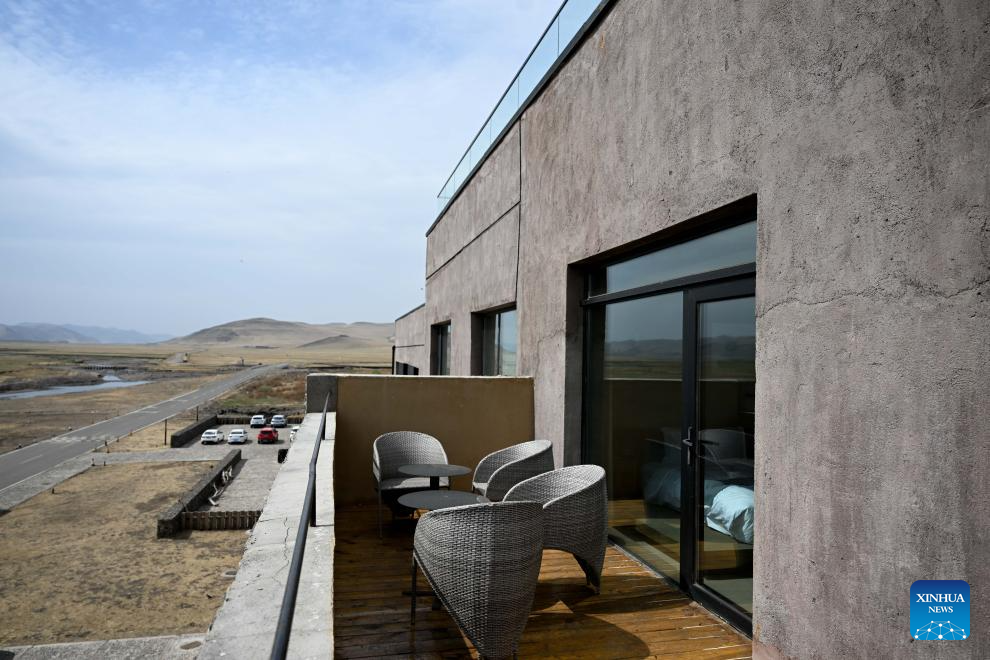 This photo taken on May 10, 2024 shows a grassland homestay on the Ulan Mod grassland, located in Horqin Right Wing Front Banner, Hinggan League of north China's Inner Mongolia Autonomous Region. In recent years, a grassland homestay cluster in Hinggan League of north China's Inner Mongolia Autonomous Region, has become a new driving force for the high quality development of grassland tourism. The cluster concludes homestays, hotels, libraries, bakeries, cafes, art galleries and other facilities with modern and traditional elements, providing a place for tourists to relax and enjoy the scenery of the Ulan Mod grassland. (Xinhua/Bei He)