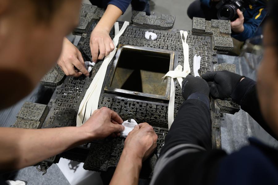 Staff members pack an exhibit which is to be exhibited in San Francisco, at Hubei Provincial Museum in Wuhan, central China's Hubei Province, March 4, 2024. (Xinhua/Hu Jingwen)