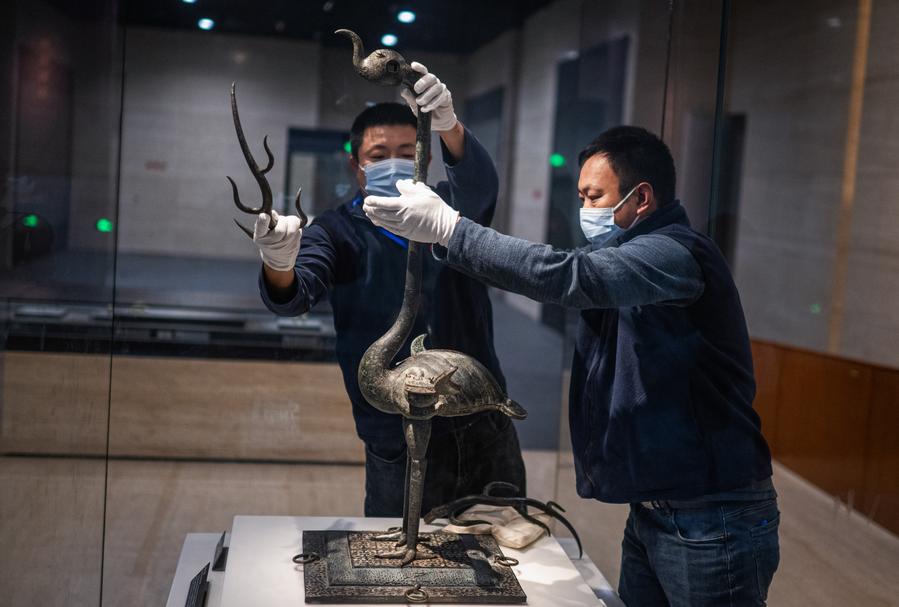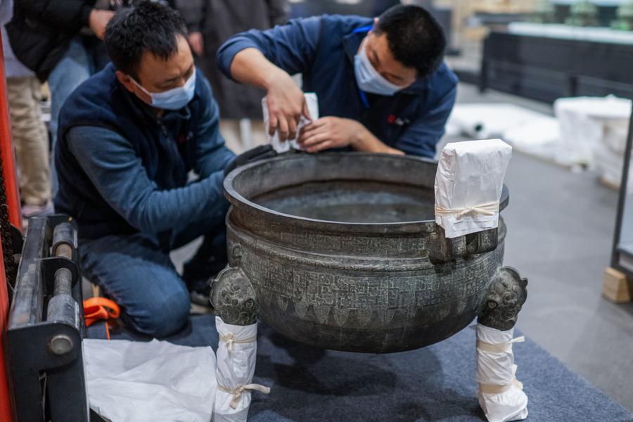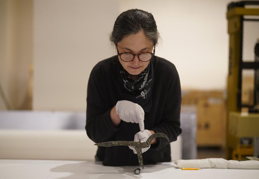 A staff member checks an exhibit for a major exhibition of Chinese cultural relics from China's Bronze Age in San Francisco, California, the United States, March 22, 2024. (Xinhua/Wu Xiaoling)