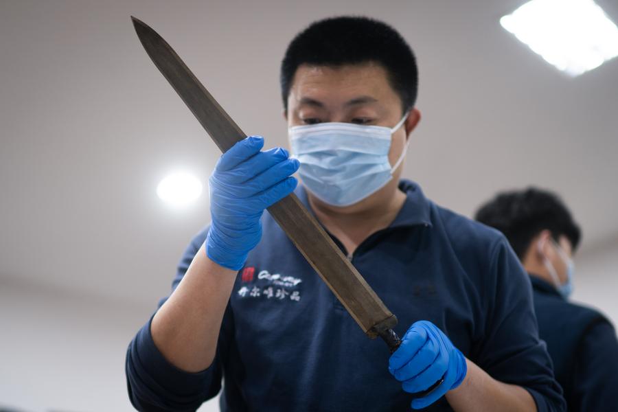 A staff member packs an exhibit which is to be exhibited in San Francisco, in Jingzhou, central China's Hubei Province, Feb. 28, 2024. (Xinhua/Xiao Yijiu)