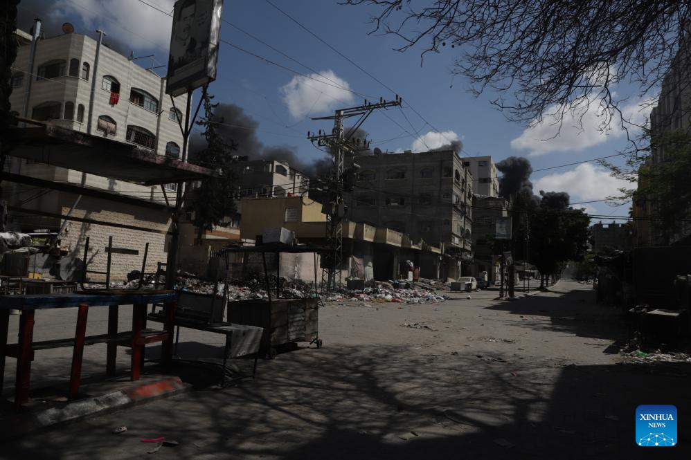 Smoke rises following Israeli strikes in Jabaliya refugee camp, northern Gaza Strip, on May 13, 2024. (Photo by Abdul Rahman Salama/Xinhua)