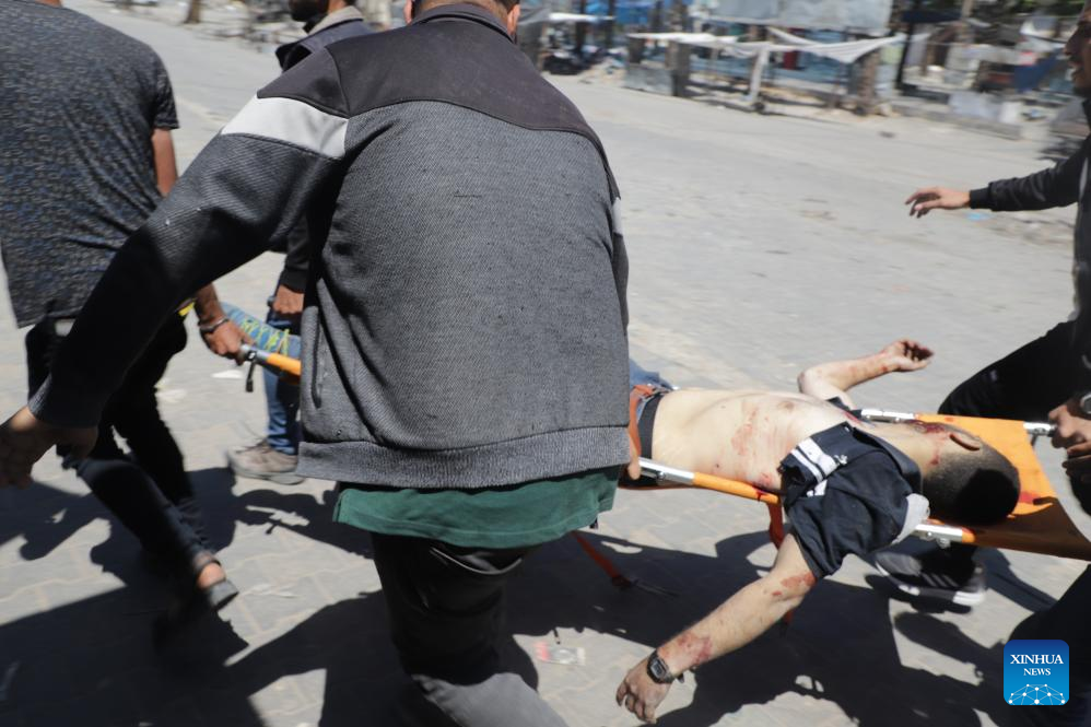 An injured man is transferred after Israeli strikes in Jabaliya refugee camp, northern Gaza Strip, on May 13, 2024. (Photo by Abdul Rahman Salama/Xinhua)