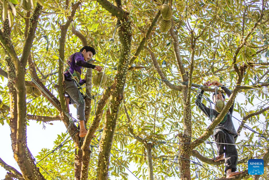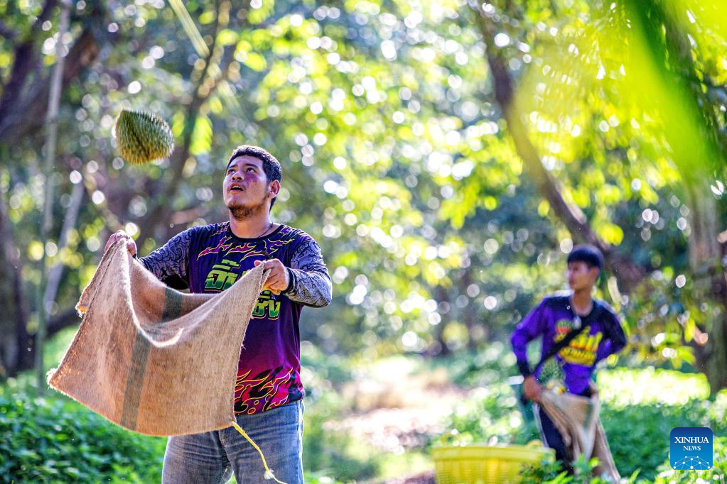 Workers harvest durians in a durian orchard in Chanthaburi, Thailand, April 26, 2024. Thailand is one of the world's leading producers and exporters of durian, exporting large quantities to China each year. According to data from China's General Administration of Customs, in 2023, China imported 1.426 million tonnes of fresh durian, with 929,000 tonnes coming from Thailand, accounting for 65.15 percent of China's total fresh durian imports. (Xinhua/Wang Teng)