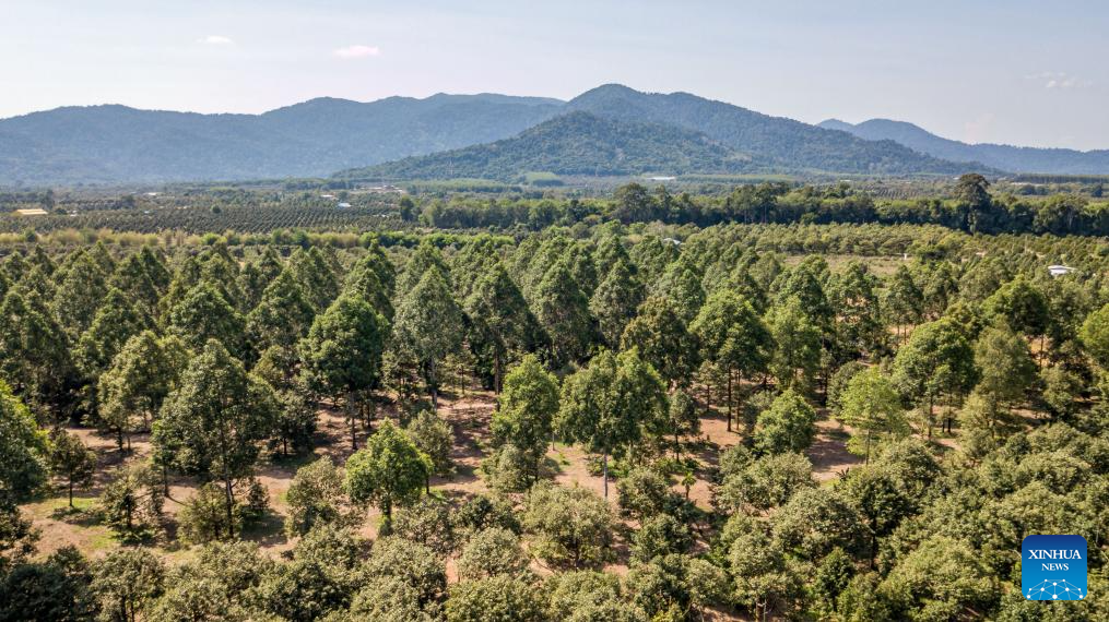 A drone photo shows a durian orchard in Chanthaburi, Thailand, April 26, 2024. Thailand is one of the world's leading producers and exporters of durian, exporting large quantities to China each year. According to data from China's General Administration of Customs, in 2023, China imported 1.426 million tonnes of fresh durian, with 929,000 tonnes coming from Thailand, accounting for 65.15 percent of China's total fresh durian imports. (Xinhua/Wang Teng)