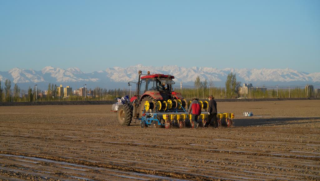 Farmers prepare a cotton sowing machine at a field in Shawan City, northwest China's Xinjiang Uygur Autonomous Region, April 19, 2024. (Xinhua/Aman)