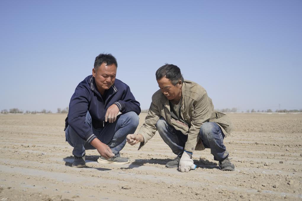 He Hongtao (L) works at a cotton field in Shawan City, northwest China's Xinjiang Uygur Autonomous Region, April 23, 2024. (Photo by Ma Jinming/Xinhua)