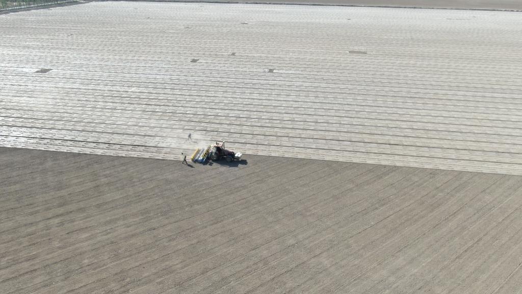 An aerial drone photo taken on April 23, 2024 shows a sowing machine working at a cotton field in Shawan City, northwest China's Xinjiang Uygur Autonomous Region. (Photo by Ma Jinming/Xinhua)