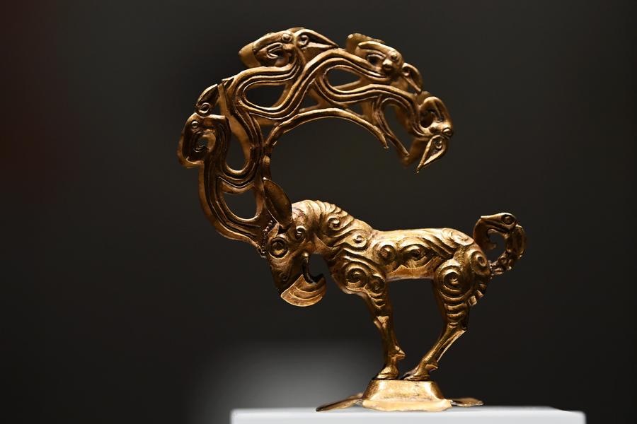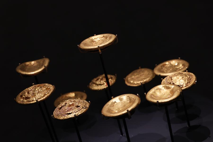 Gold ware is displayed at the Qin Han Museum of the Shaanxi History Museum in Xi'an, capital of northwest China's Shaanxi Province, April 15, 2024. (Xinhua/Li Yibo)