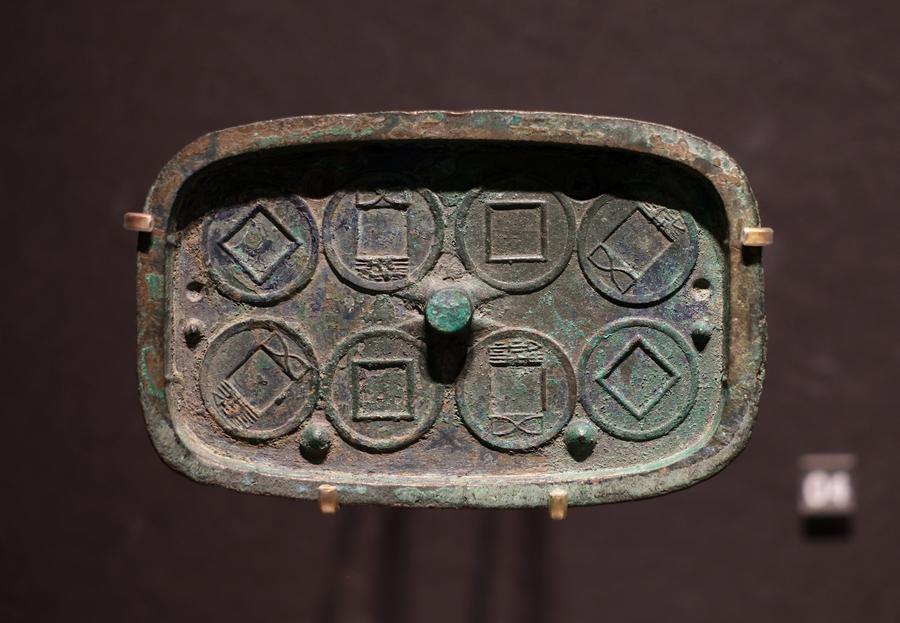 A copper mold used to make copper coins is displayed at the Qin Han Museum of the Shaanxi History Museum in Xi'an, capital of northwest China's Shaanxi Province, April 15, 2024. (Xinhua/Li Yibo)