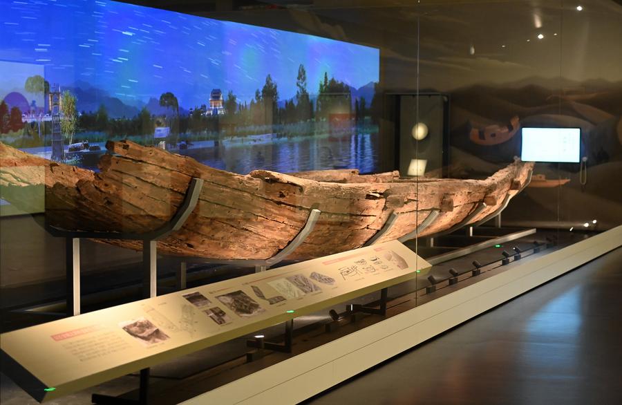 An ancient ship is displayed at the Qin Han Museum of the Shaanxi History Museum in Xi'an, capital of northwest China's Shaanxi Province, May 6, 2024. (Xinhua/Li Yibo)