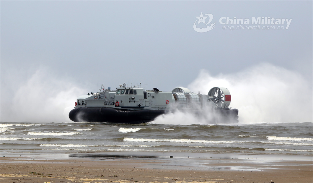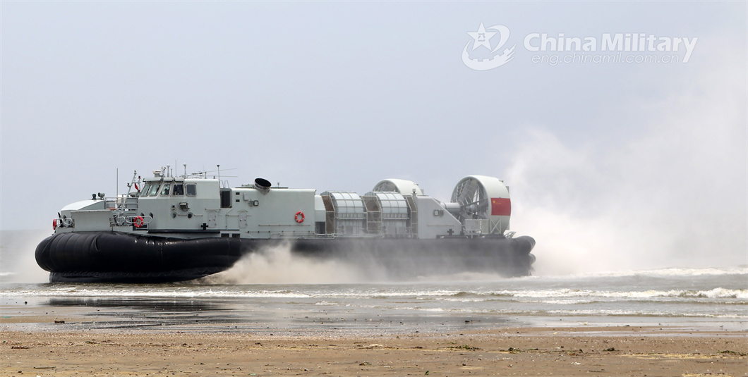 A landing craft air cushion (LCAC) attached to a naval landing ship group under the PLA Southern Theater Command dashes to the beach-head during a beach landing training exercise on May 7, 2024. (eng.chinamil.com.cn/Photo by Gu Yagen)