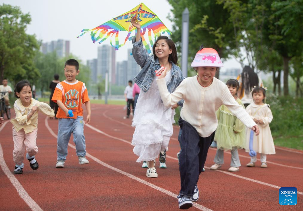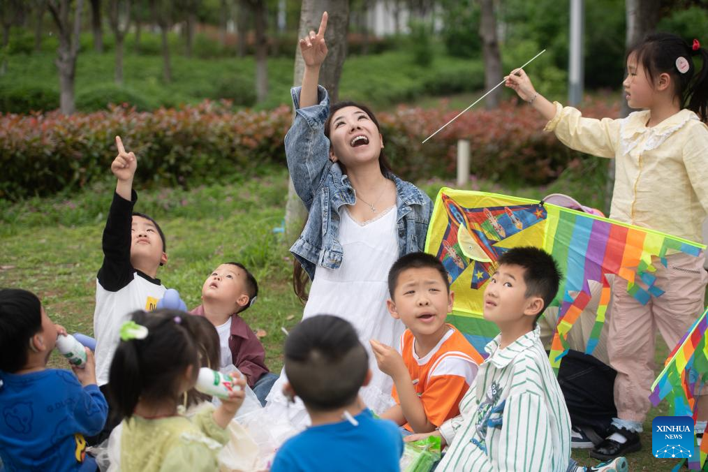 Li Hongjia and hearing-impaired children fly a kite at a park in Jiangxia District of Wuhan, central China's Hubei Province, April 20, 2024.(Xinhua/Du Zixuan)
