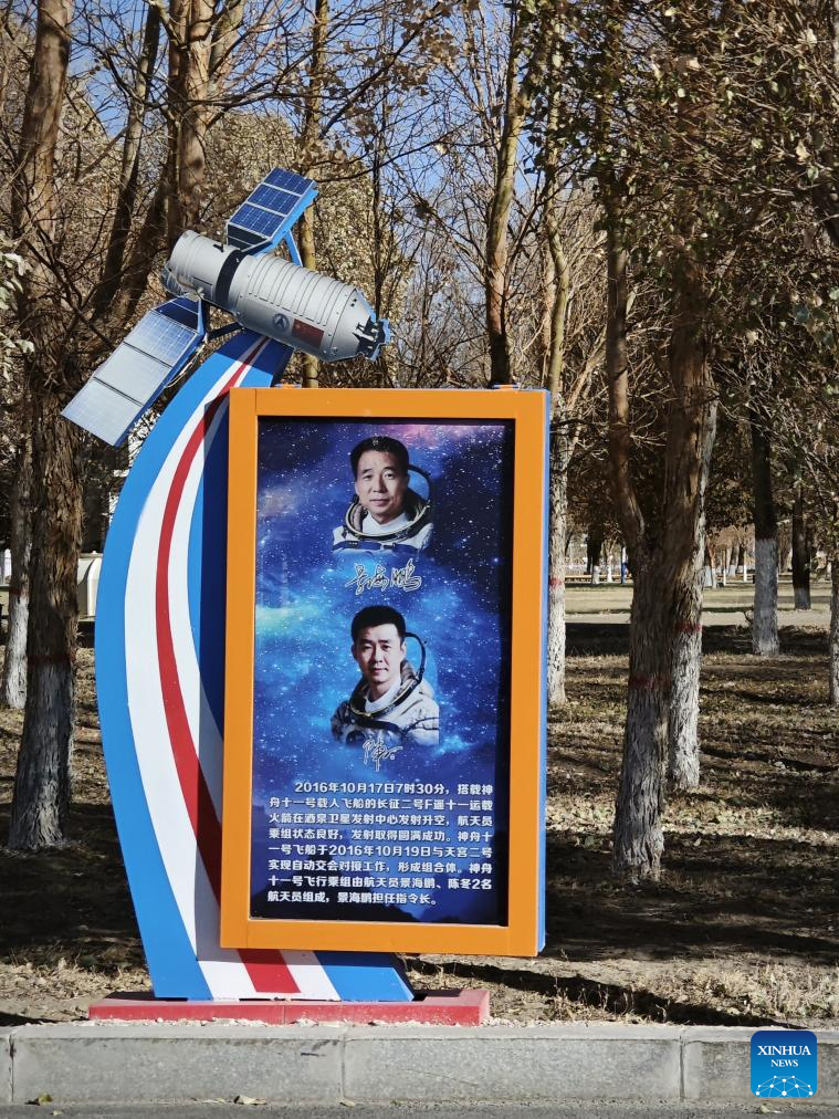 This photo taken on Nov. 26, 2023 shows a poster about Chinese taikonauts in the Dongfeng Space City in northwest China. (Xinhua/Jia Zhao)