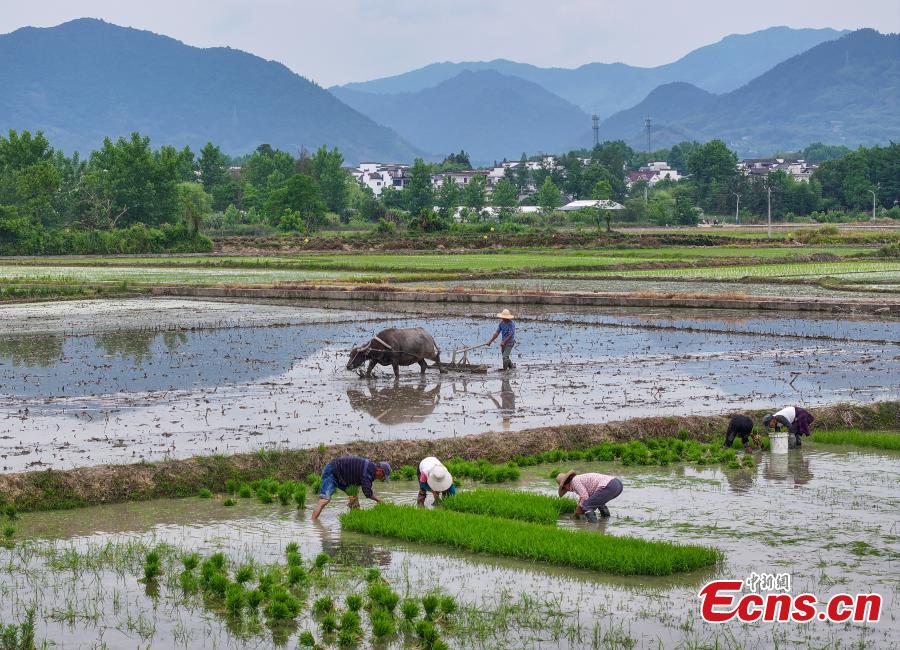 Villagers work on a rice field ahead of the traditional Chinese solar term Xiaoman (grain buds) which falls on May 20 this year. (Photo: China News Service/Shi Yalei)