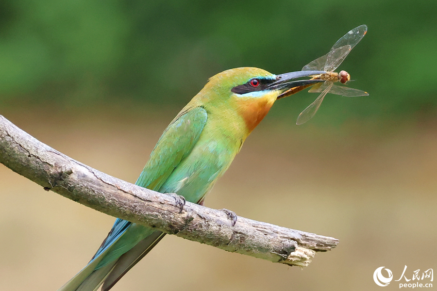 A blue-tailed bee-eater preys on dragonflies. (People's Daily Online/Chen Bo)