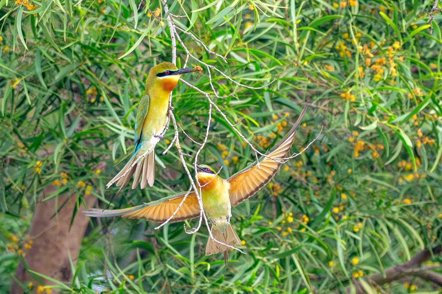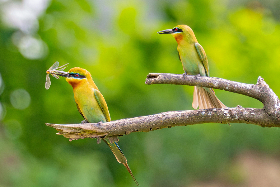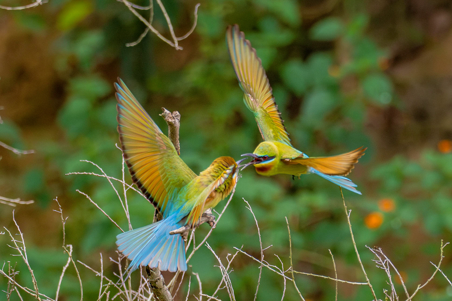 Blue-tailed bee-eaters play and frolic in the forest of the nature reserve. (Photo by Zhou Zhiqiang)