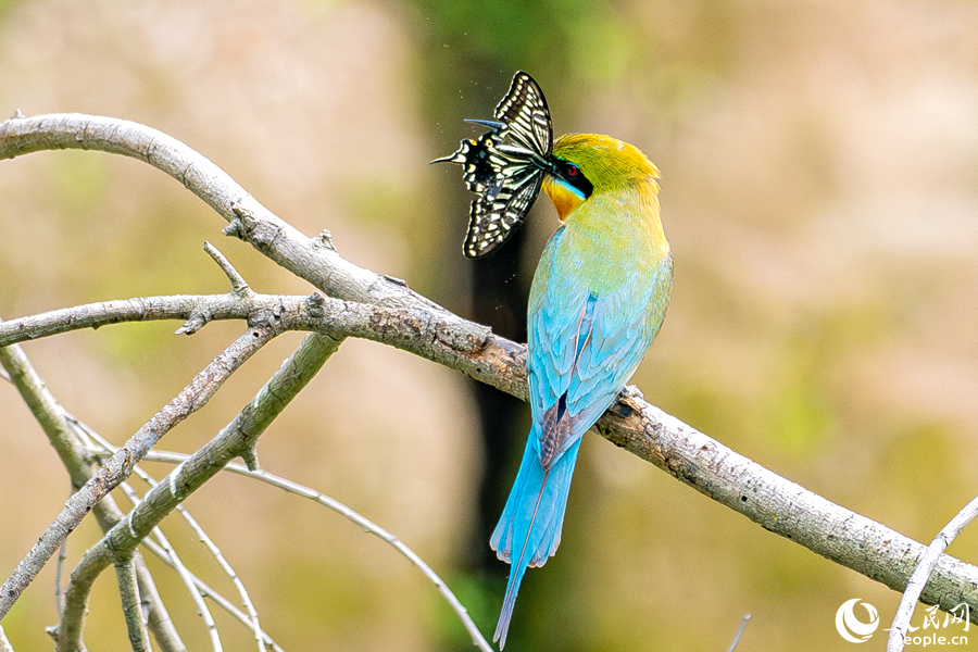 A blue-tailed bee-eater carrying a butterfly perches on a withered tree by the water. (People’s Daily Online/Chen Bo)