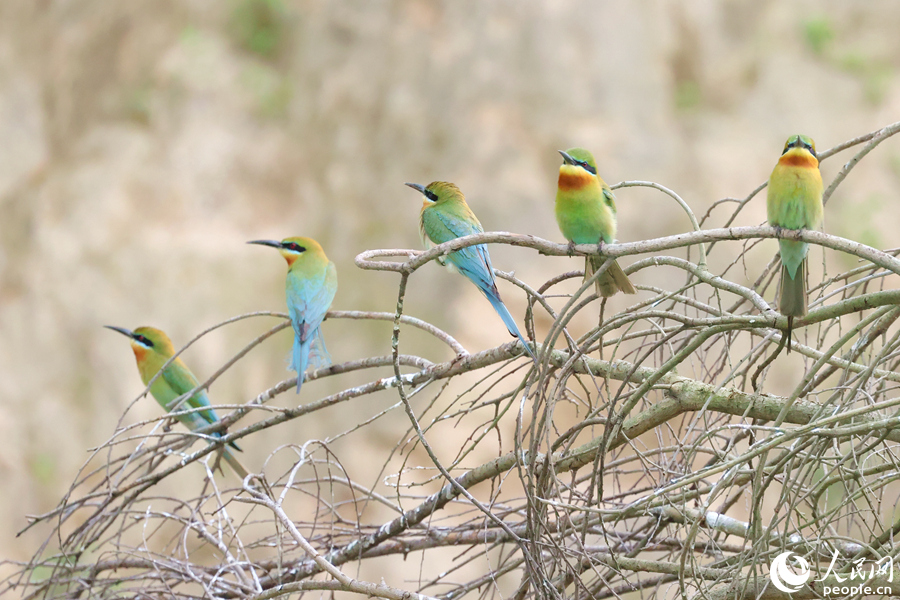 Five blue-tailed bee-eaters stand in a row on the branches of a withered tree. (People’s Daily Online/Chen Bo)