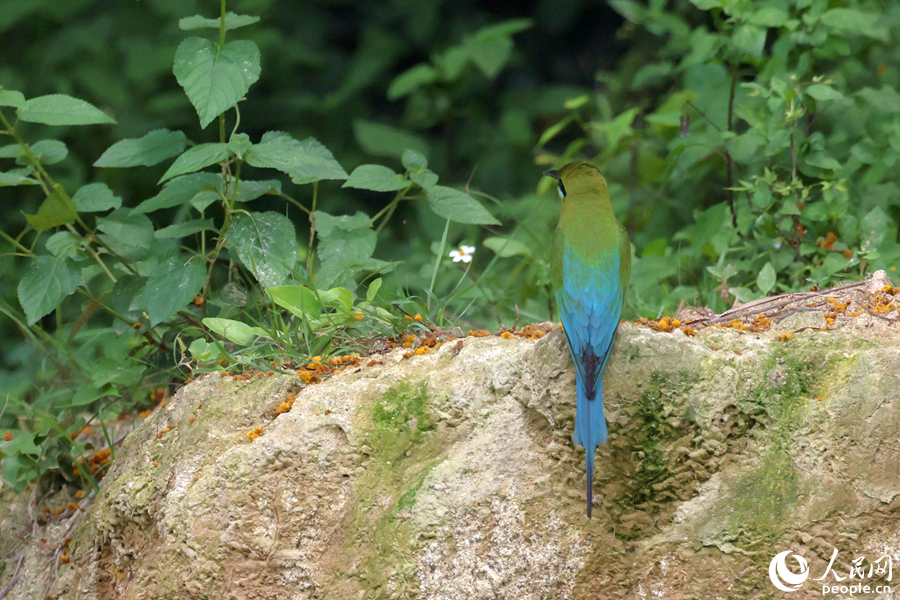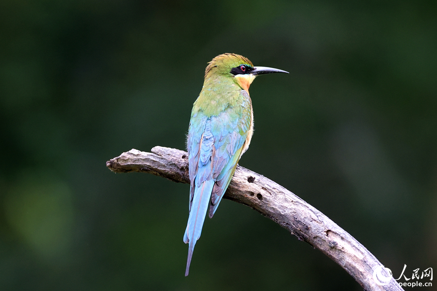 The blue-tailed bee-eater's blue-green back feathers make it appear as if it's wearing an invisibility cloak, blending seamlessly into the surrounding greenery. (People's Daily Online/Chen Bo)