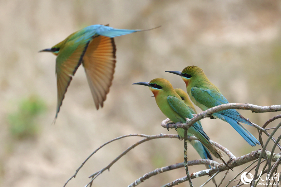 Blue-tailed bee-eaters fly back and forth between the cliff face and the withered trees. (People's Daily Online/Chen Bo)