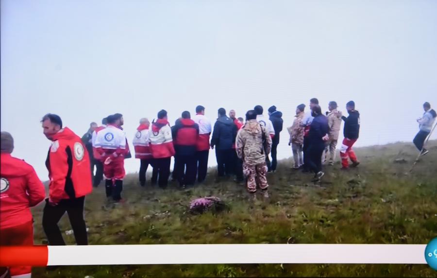 This photo taken on May 20, 2024 shows rescue workers arriving at a helicopter accident site in East Azarbaijan province of Iran on the footage of Iran's state-run IRIB TV. (Xinhua/Shadati)