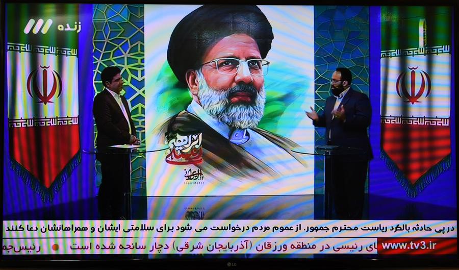 This photo taken on May 19, 2024 shows a poster of Iranian President Ebrahim Raisi on the footage of national Iranian television. (Xinhua/Shadati)