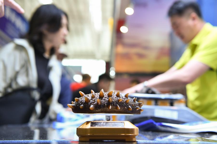 A sea cucumber from Australia is displayed during the eighth China-Russia Expo in Harbin, northeast China's Heilongjiang Province, May 20, 2024. (Xinhua/Wang Song)