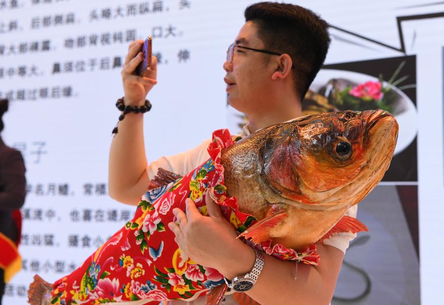 An exhibitor shows a bighead carp during the eighth China-Russia Expo in Harbin, northeast China's Heilongjiang Province, May 20, 2024. (Xinhua/Wang Song)