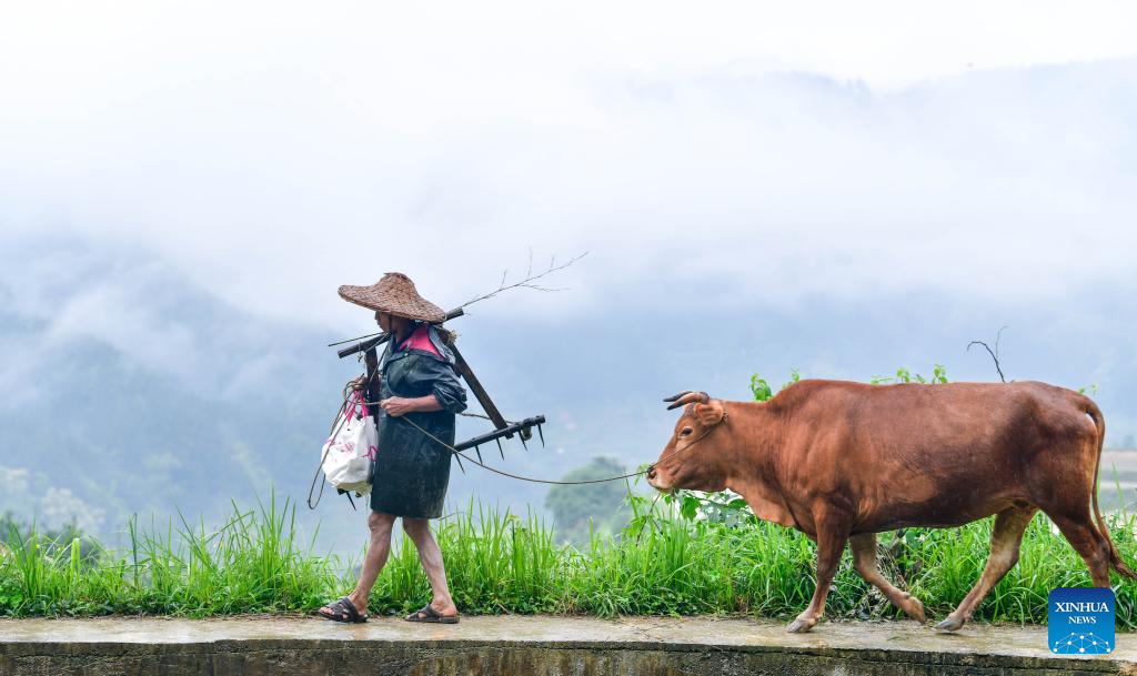 A farmer and a head of cattle are pictured near terraced fields during an event presenting the local agricultural traditions in Liping County, southwest China's Guizhou Province, May 18, 2024. (Xinhua/Yang Wenbin)