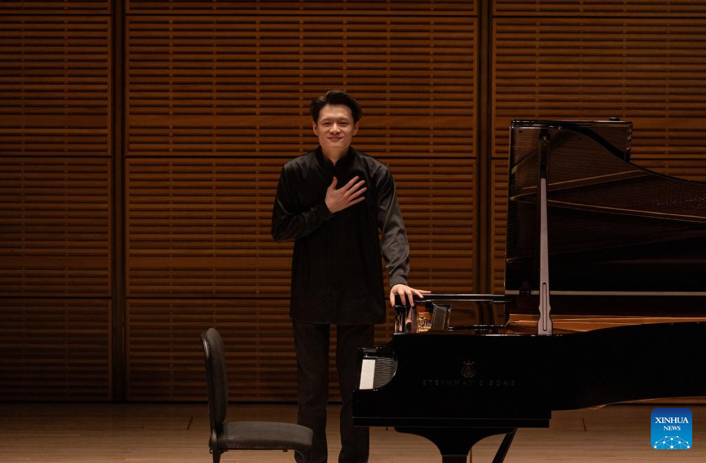 Chinese pianist Ju Xiaofu greets the audience at Carnegie Hall in New York, the United States, on May 19, 2024. (Photo by Pan Liang/Xinhua)