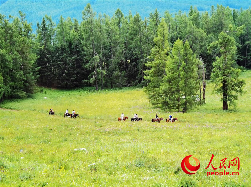 Tourists ride horses in Kanas scenic area in Altay Prefecture, northwest China’s Xinjiang Uygur Autonomous Region. (People’s Daily Online/Han Ting)
