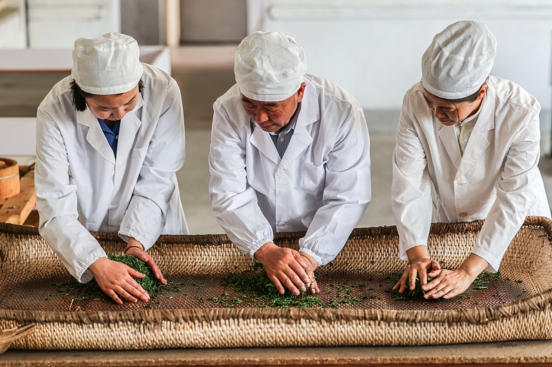 A worker shows apprentices Niancha, a traditional technique to rub tea leaves, in Qingdao, east China's Shandong Province. (Photo/CFP)