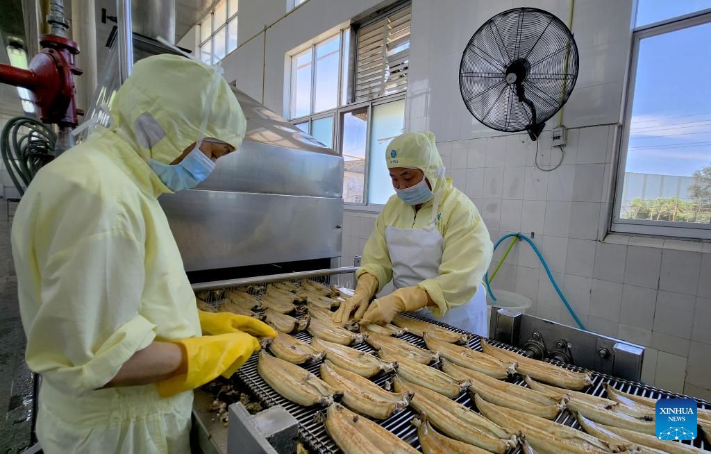 Workers process grilled eels at a factory in Fuzhou, southeast China's Fujian Province, May 15, 2024. (Xinhua/Wei Peiquan)