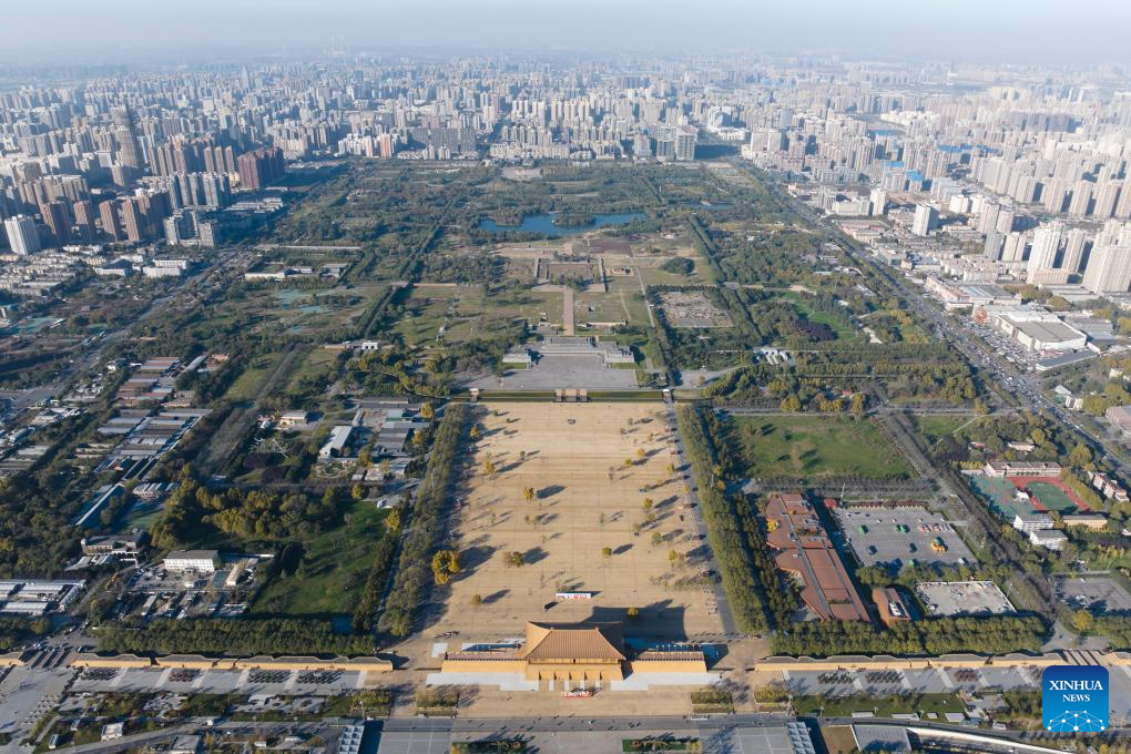 An aerial drone photo taken on Nov. 17, 2023 shows a view of the Daming Palace National Heritage Park in Xi'an, northwest China's Shaanxi Province. Xi'an, one of the ancient capitals in Chinese history, attracts a growing number of tourists in recent years. (Xinhua/Shao Rui)