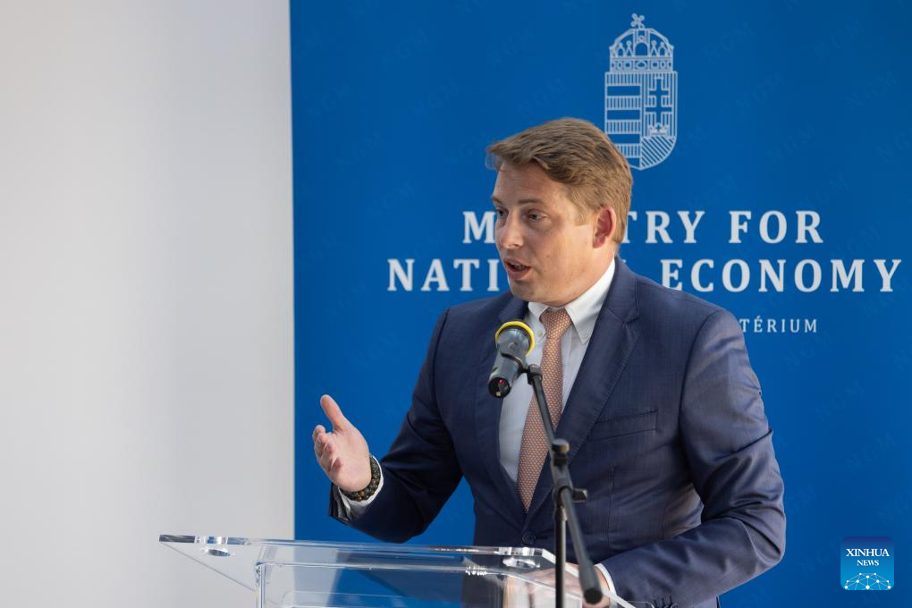 Marton Nagy, Hungarian minister for national economy, attends a signing ceremony in Budapest, Hungary, on May 21, 2024. China's NIO, a leading global smart electric vehicle (EV) company, announced a strategic partnership with Hungary's Istvan Szechenyi University Foundation here on Tuesday. (Photo by Attila Volgyi/Xinhua)