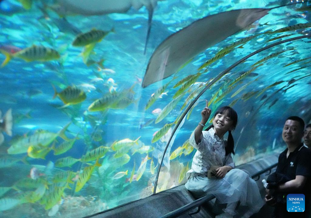 Tourists view sea life at Sunasia Ocean World in Dalian, northeast China's Liaoning Province, May 22, 2024. Various scenic spots in Dalian see surging tourists as the coastal city reaches the peak of its tourism season. The sites as zoos and aquariums even the natural places where tourists can see wild animals are among the increasingly popular destinations for the tourists. (Xinhua/Zhang Lei)