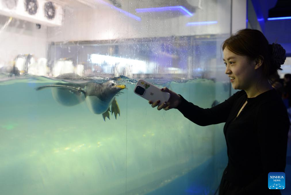 A tourist interacts with a penguin at Sunasia Ocean World in Dalian, northeast China's Liaoning Province, May 22, 2024. Various scenic spots in Dalian see surging tourists as the coastal city reaches the peak of its tourism season. The sites as zoos and aquariums even the natural places where tourists can see wild animals are among the increasingly popular destinations for the tourists. (Xinhua/Liu Yun)