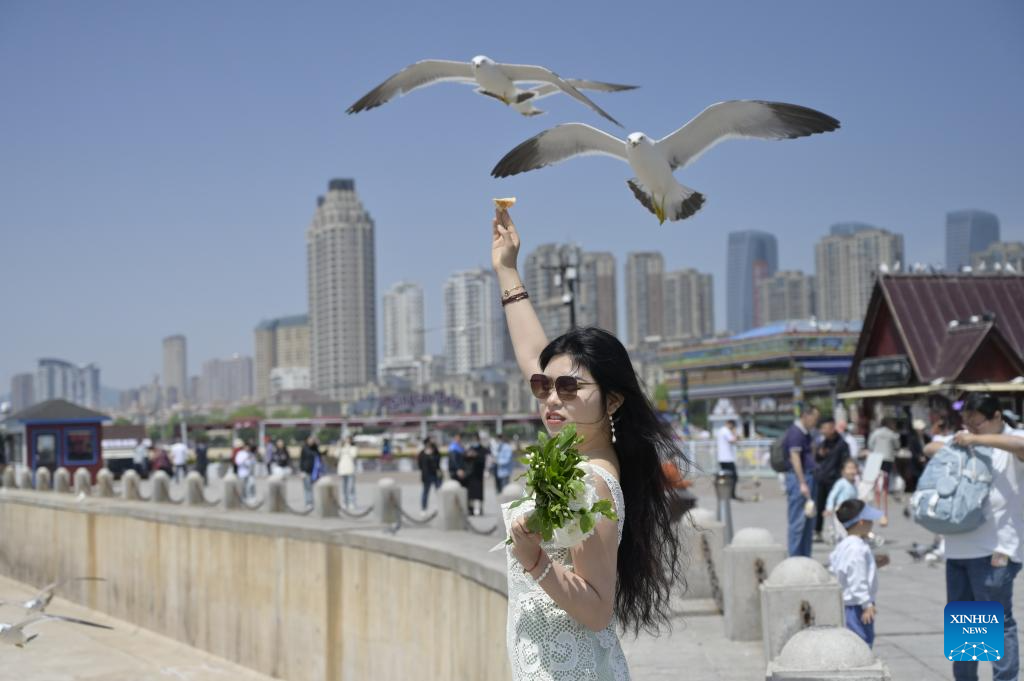 A tourist feeds a seagull at Xinghai Square in Dalian, northeast China's Liaoning Province, May 22, 2024. Various scenic spots in Dalian see surging tourists as the coastal city reaches the peak of its tourism season. The sites as zoos and aquariums even the natural places where tourists can see wild animals are among the increasingly popular destinations for the tourists. (Xinhua/Zhang Lei)