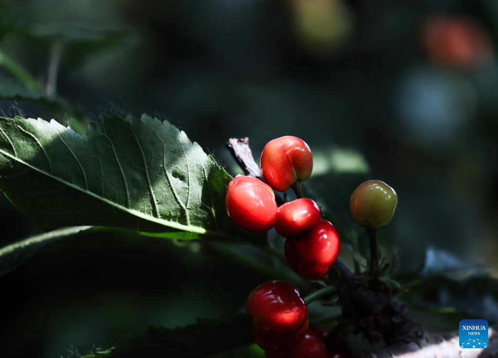 This photo taken on May 22, 2024 shows cherries at a farm in Nanhu Town of Rizhao City, east China's Shandong Province. Relying on its natural scenery and convenient transportation, Nanhu Town of Rizhao City has been vigorously developing ecological tourism featuring fruits-picking tours and agritainment in recent years. Agricultural farms for leisure see increasing popularity among tourists and locals. (Photo by Lan Hongguang/Xinhua)