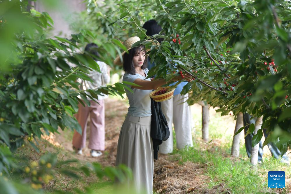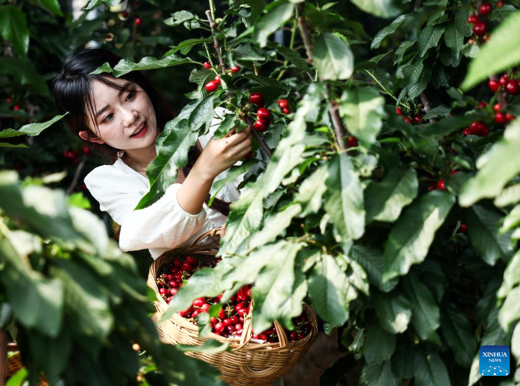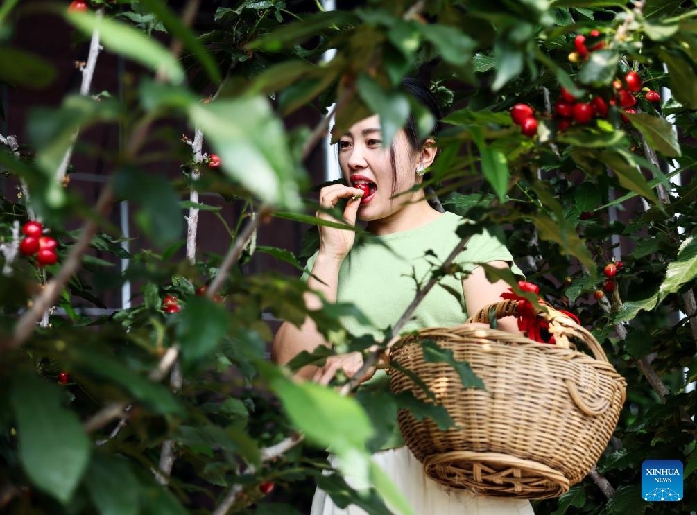 A tourist picks cherries at a farm in Nanhu Town of Rizhao City, east China's Shandong Province, May 22, 2024. Relying on its natural scenery and convenient transportation, Nanhu Town of Rizhao City has been vigorously developing ecological tourism featuring fruits-picking tours and agritainment in recent years. Agricultural farms for leisure see increasing popularity among tourists and locals. (Xinhua/Meng Tao)