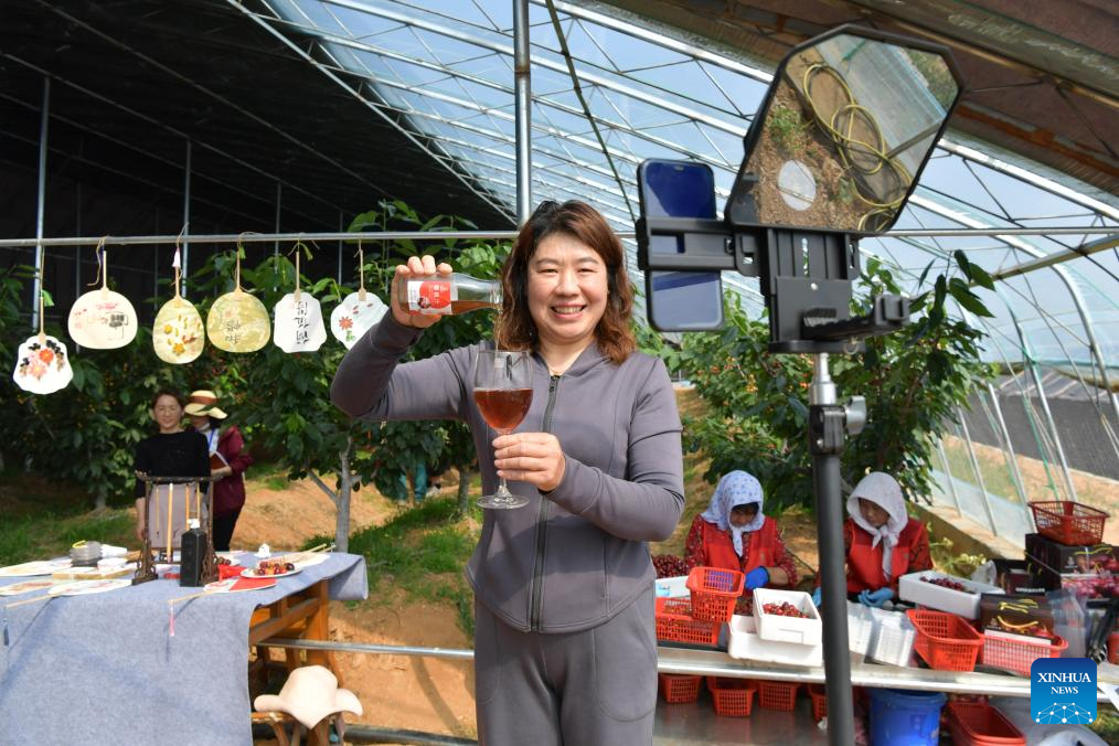 Xu Juan, a farm manager, promotes a cherry juice product via livestreaming at a farm in Nanhu Town of Rizhao City, east China's Shandong Province, May 22, 2024. Relying on its natural scenery and convenient transportation, Nanhu Town of Rizhao City has been vigorously developing ecological tourism featuring fruits-picking tours and agritainment in recent years. Agricultural farms for leisure see increasing popularity among tourists and locals. (Xinhua/Meng Tao)
