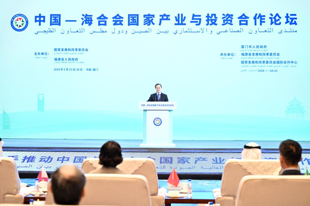 Chinese Vice Premier Ding Xuexiang, also a member of the Standing Committee of the Political Bureau of the Communist Party of China Central Committee, attends and addresses the China-Gulf Cooperation Council (GCC) Countries Forum on Industrial and Investment Cooperation in Xiamen, southeast China's Fujian Province, May 23, 2024. Ding also read a congratulatory letter by Chinese President Xi Jinping to the forum. (Xinhua/Yan Yan)