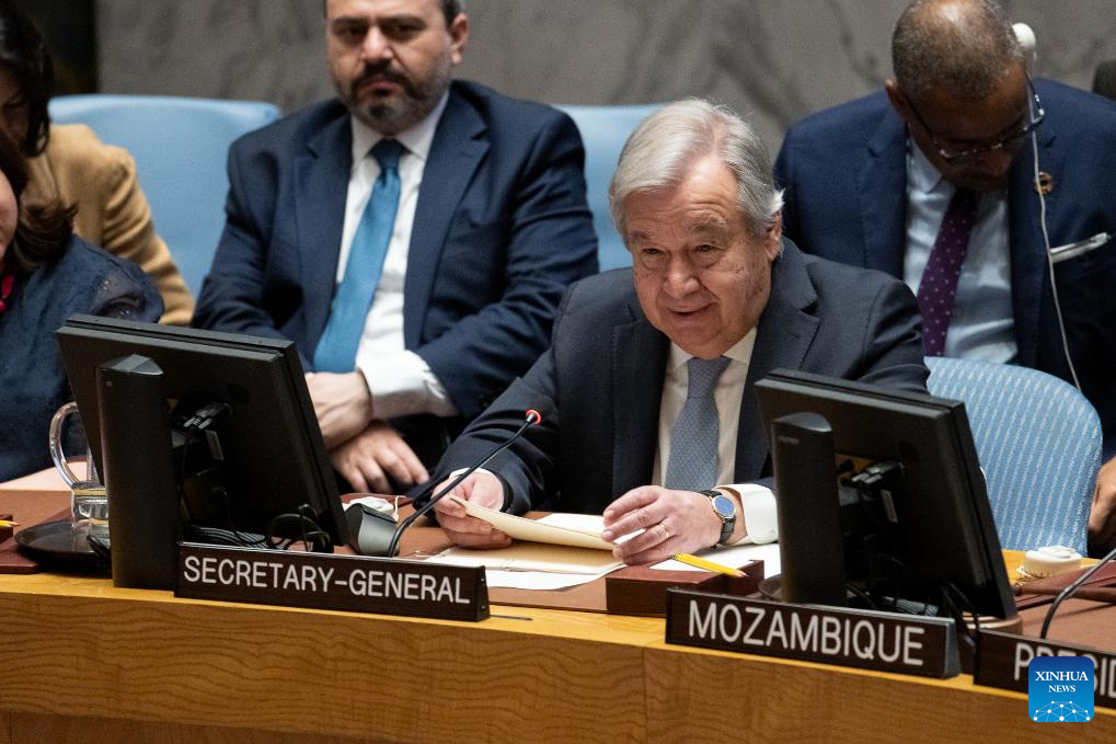 UN Secretary-General Antonio Guterres (C) speaks at a Security Council meeting at the UN headquarters in New York, on May 23, 2024. Guterres said Thursday that there is a need to embed African participation and leadership across the global peace and security architecture. (Loey Felipe/UN Photo/Handout via Xinhua)