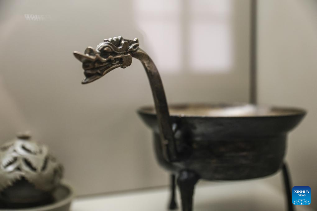Photo taken on March 11, 2024 shows small bronze vessel Jiaodou at the Asian Art Museum in Turin, Italy. In the heart of Turin, Italy, stands a museum of oriental art, which serves as a unique bridge between the Southern European country and China. At the helm of the museum is Davide Quadrio, an Italian curator whose life's work has been fostering cultural exchanges between these two ancient civilizations. (Xinhua/Li Jing)